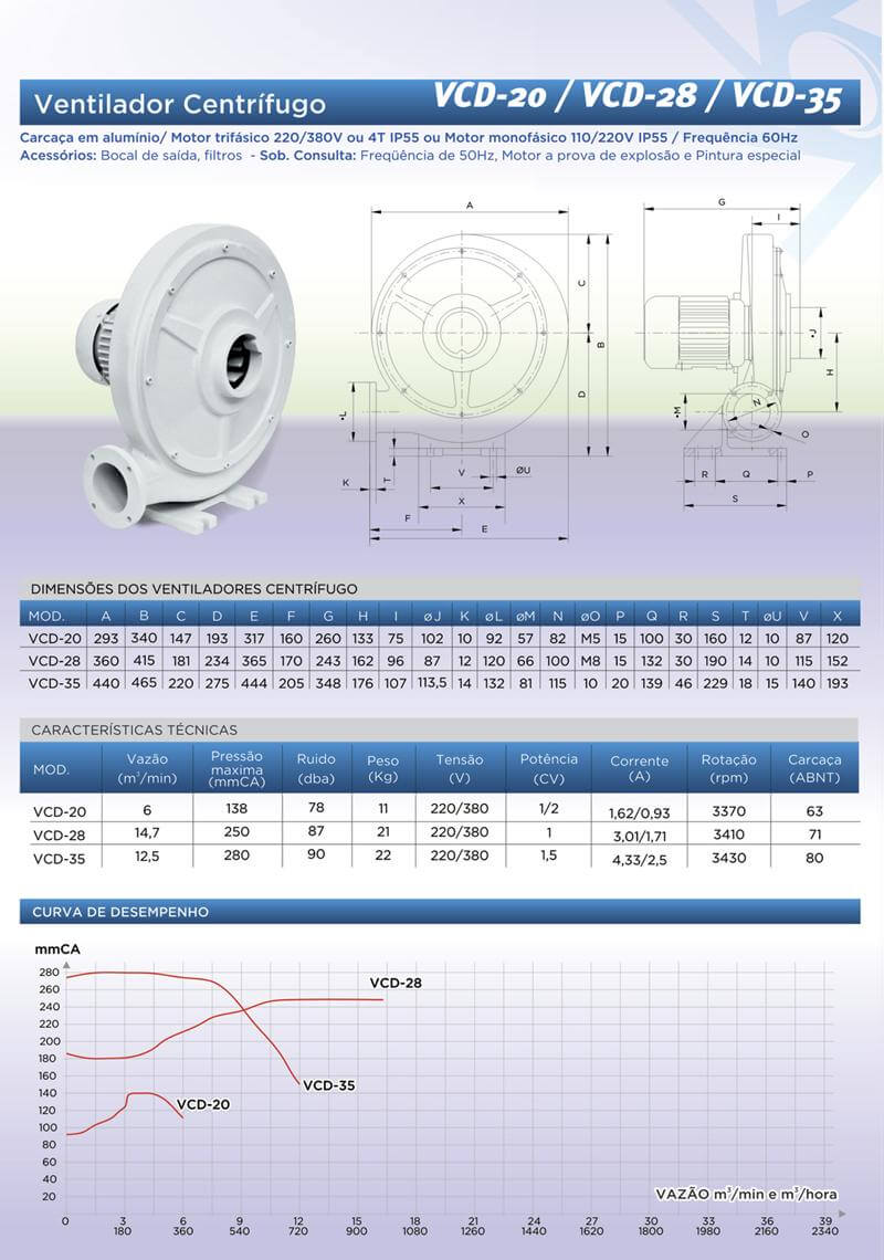 Os ventiladores de tipo Centrifugo são equipamentos que possuem sua carcaça em aluminio fundido dando uma maior resistencia ao produto e maior durabilidade. Estes equipamentos são fabricados com rotores (hélices) de diversas formas, o que proporciona uma grande variedade na relação vazão e pressão, em potenciais que variam de 0,5CV até 15CV, tanto monofásico (110/220V) quanto trifásico 220/380/440/760V.